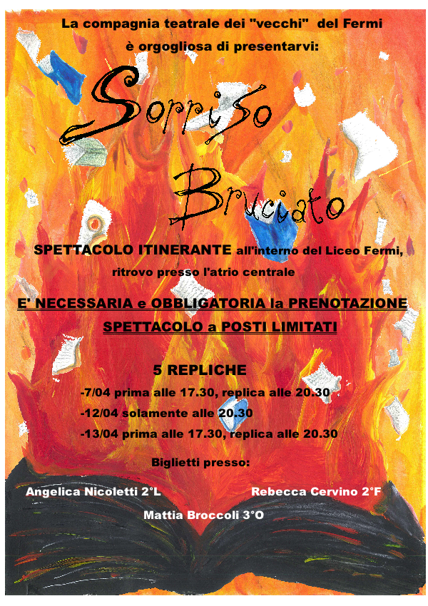 La compagnia del lab teatrale dei “vecchi” del Fermi presenta: SORRISO BRUCIATO (liberamente ispirato da Fahrenheit 451 di R. Bradbury) Spettacolo itinerante (a numero limitato di posti) all’interno del Liceo Fermi. PRENOTAZIONE OBBLIGATORIA. [Vedi Locandina]